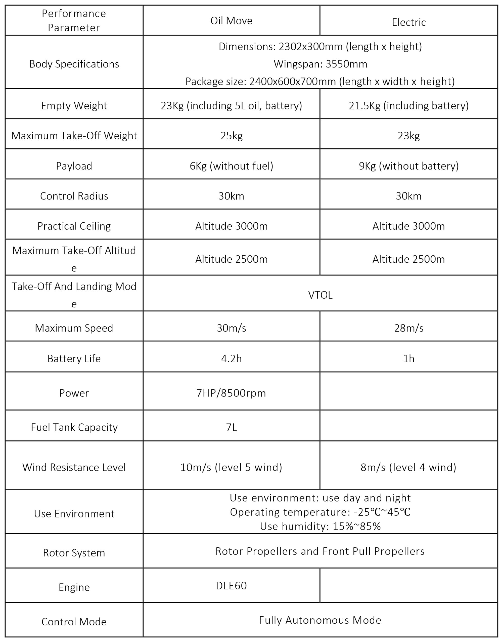 Vertical take-off and landing: Carefully create a working mode in which the rotor power system matches the fixed wing to achieve free switching between vertical and horizontal flight, and the efficient vertical take-off and landing system greatly reduces the requirements for operators, venues, and airspace;